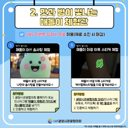 이벤트 참여를 원할 경우 광양시관광협의회 인스타그램 또는 홈페이지에서 ‘매돌이 체험관 가이드북’ 게시물을 확인한 뒤 가장 기대되는 체험명과 기대평을 댓글로 남기고 네이버 폼에 인증하면 된다.