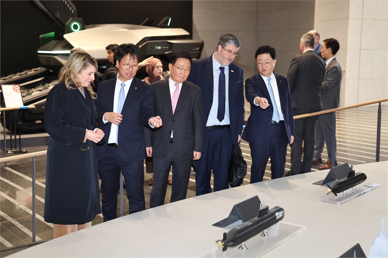 졸리 장관 일행은 HD현대 로비에서 미래형 선박, 잠수함, 호위함, 무인수상정 등 함정 모형을 관람했다. 이어 조석 부회장으로부터 HD현대의 글로벌 조선 경쟁력과 캐나다 해군 사업 관련 현황을 보고받았다.