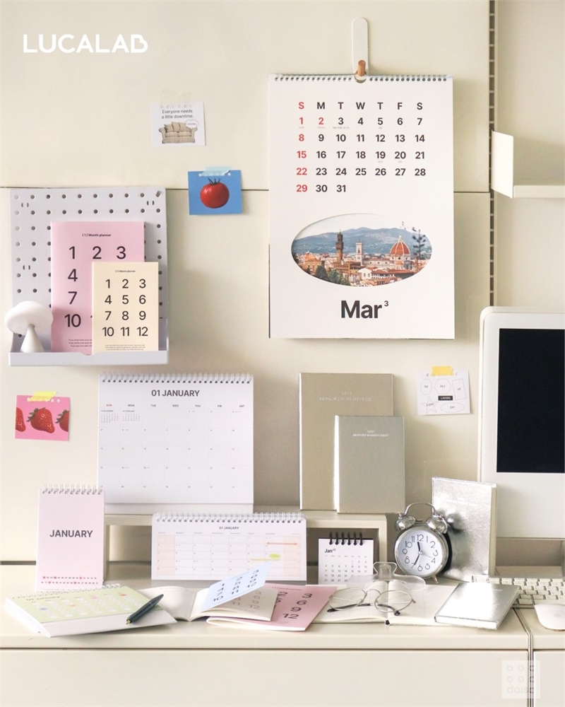 탁상형 달력 형태의 루카랩 습관 체크 캘린더는 앞뒷면을 같은 월에 각기 다른 용도로 사용할 수 있다. 앞면은 일정과 계획을 기록하는 일반 달력으로 사용한다. 뒷면은 월(月) 옆에 독서, 운동 등 지키고 싶은 습관을 기록한 후 일자별로 체크하기 편리하게 디자인했다.