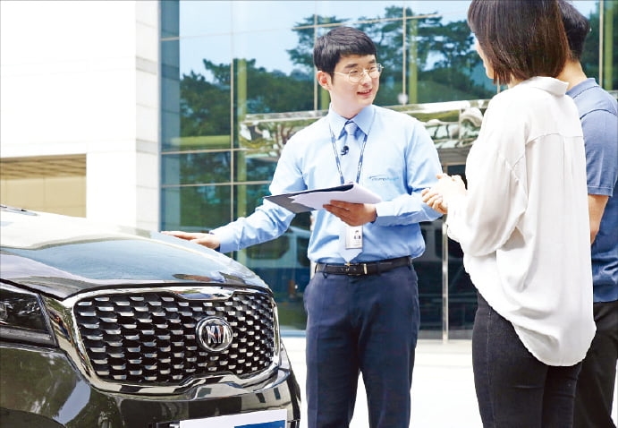 현대글로비스 ‘오토벨 내차팔기’ 컨설턴트가 고객들에게 차량 상태를 소개하고 있다. (사진=현대글로비스)