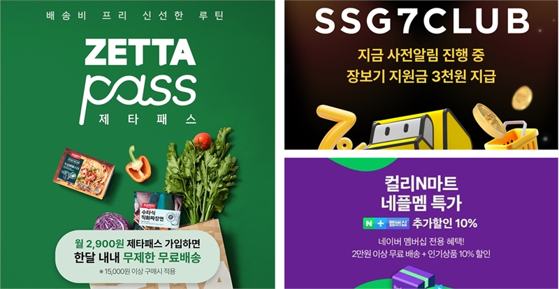 (왼쪽 시계방향) 롯데마트 제타, SSG닷컴 쓱세븐클럽, 컬리N마트(사진=각 사)