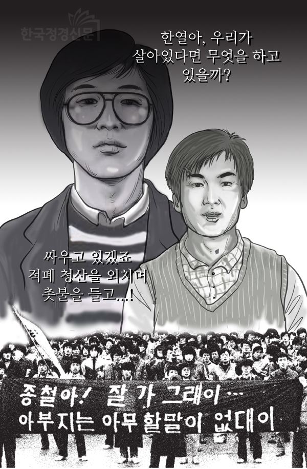 박종철 · 이한열 열사가 지금 살아있다면 무엇을 하고 있을까? 중년의 나이로 누군가의 아버지이자 사회의 기성세대로 살아가고 있을 것이다. 또한 87년 그 뜨거운 항쟁의 한 가운데에 서서 외쳤던 것처럼 광화문 광장에서 촛불을 들고 '적페 청산'을 외쳤으리라.